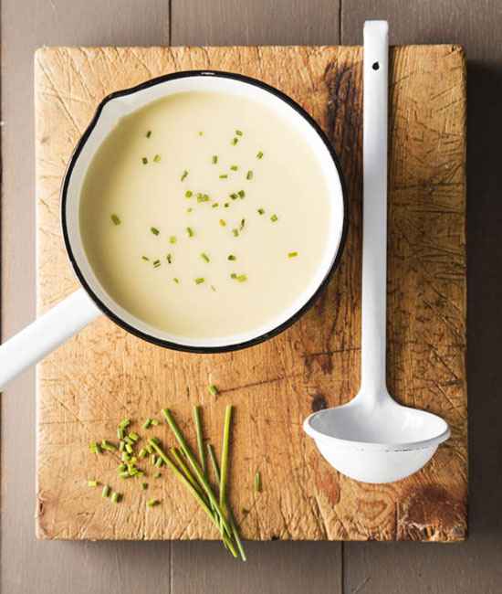 Cauliflower recipes get a bad rap, in my opinion. When absolutely fresh, as it is in the fall, it offers a wonderful crispness and mild taste that melds well with other flavors. This soup takes advantage of this classic autumn vegetable, and has one other terrific trait: it’s delicious either hot or cold. Of course in the fall or winter you’d probably serve it hot, but the cold version is a lot like vichyssoise except with fewer calories. Two other garnishes that offer a nice color contrast are chopped pistachios and red pepper purée; also delicious, especially on the hot version of this soup, is Parmesan Lace.