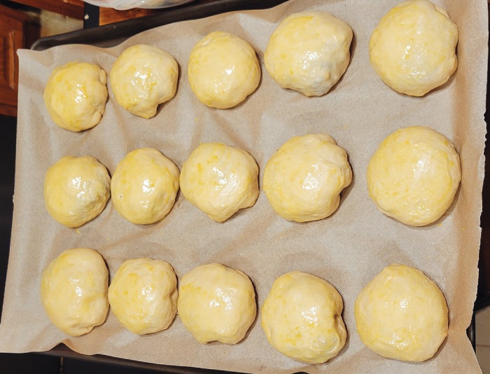 - Dough and Egg Wash: In a large bowl, whisk together yeast, 2 teaspoons sugar, and the water, and let it sit until frothy. In a pan, scald the milk, then add the butter to melt while the milk cools. Add the eggs to the bowl with the yeast. Add the milk (you may need to add an ice cube to cool it further if the butter has melted and the milk is still hot), 2/3 cup sugar, and salt to the yeast mixture, stirring to combine.