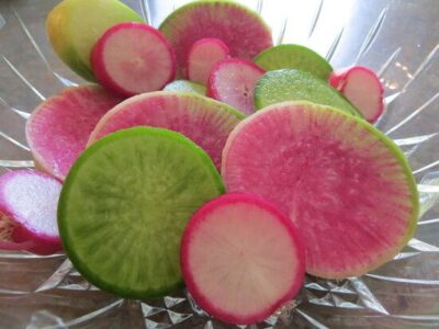 One of the sweetest dishes you can make in the winter comes from vegetables we tend to associate with peppery flavors. Roasting works magic on turnips and winter radishes. We grow Shawo Fruit Radish (bright lime green) and Chinese Red Meat (green skin/fuchsia meat) radishes along with gold turnips. These varieties are the milder of their types and cook up rich and sweet.