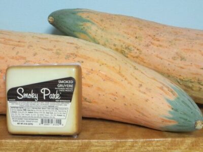 North Georgia Candy Roaster is a special type of winter squash that is hard to find so we suggest you grow your own. It produces 18 inch long fruit that look like an out-sized pale orange banana with blue tips. Sliced lengthwise and roasted, these lovely squash mash themselves and can be scraped right from the skin into the recipe. This is the creamiest winter squash we’ve discovered and pairs perfectly with the smoky flavor of the Gruyere.