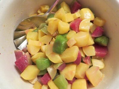Simply peel and dice 8 cups of these combined vegetables, toss with olive oil, sprinkle with kosher salt, and roast at 400 degrees for about 30 minutes until softened. It creates a colorful green, red, and gold dish that will surprise your taste buds.