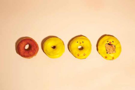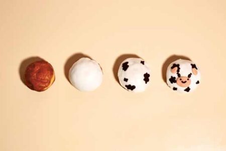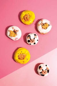 Knead a tiny amount of pink gel food dye into marzipan to colour, and then use your fingers to shape the marzipan into the cow’s nose and ears. Place these features on the doughnuts.