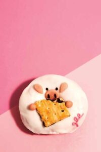 Pipe darker pink icing to detail the pig’s tail, then position your favourite (half-eaten) cookie over the doughnut hole to look as if the pig is eating it.