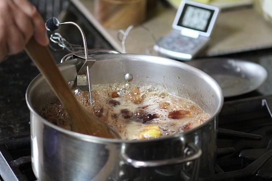 4. Add lemon juice (7 Tb) and orange juice (3.5 Tb) and rapidly bring to a boil. Stir frequently until the gelling point is reached. Here at sea level, that is 219-220 degrees Fahrenheit.