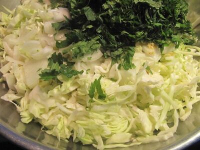 3. Finely chop foraged leaves and add them to the cabbage. Add the sliced onions and garlic.