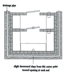 - Lay drain pipe from the floor drains in the cellar out to daylight. The floor inside the root cellar should be a bit higher than the level of soil outside the door so that water drains off.