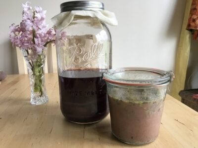 I raced home from the farmer’s market and put “Mom” in a half-gallon canning jar topped with a piece of cheesecloth and then opened a bottle of wine. It felt a little bit odd (but not unheard of) to start drinking at 10:30 AM on a Saturday, but I had to do it for Mom. I poured her some in her crock, and poured myself a glass. Why not? Cheers! Now, whenever I open a bottle, I always make sure to pour Mom a glass, too.
