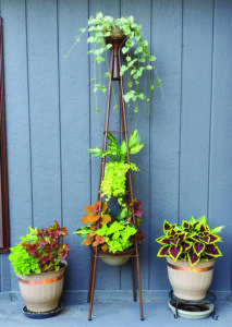 We repurposed the saucer-like shade into the large planter you see at the bottom. A plastic tomato container serves as the top planter. Finally, we added a piece of wood on the middle shelf to hold a 6-inch flowerpot.