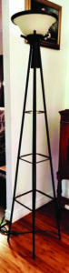 While working on downsizing at our home, we uncovered a vintage but electrically dangerous metal lamp. Instead of taking the lamp to the landfill, we removed all the wiring, took the saucer-like shade off the top, and spray-painted the metal brown.