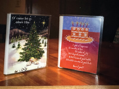 To personalize small photo albums, I remove the original store inserts from the clear plastic covers, front and back, and then replace them with colorful used greeting cards. In this way, their contents are marked as photos of birthdays, Christmas, and other festive events, and they’re easy to find.