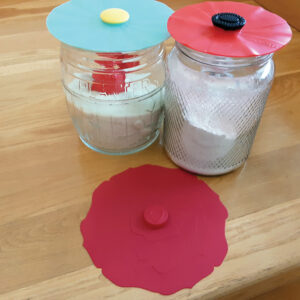 I really like my old cookie jars, but over the years, their lids have cracked and broken. Recently, I discovered a way to make the jars serviceable again. I simply cut a silicone lid for pots and pans to the right size for the top of each jar. The jars now have perfect functional lids again, and the silicone seals wonderfully over vessels I use for storing flour and sugar. This makes accessing the contents super easy, and I can retain containers with lots of memories.