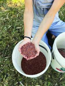 To process sorghum, we simply roll the dry seed heads over 1/4-inch screen mesh into a collecting vessel. No threshing is needed, but we do like to winnow the seed to get rid of the stems and other plant detritus.