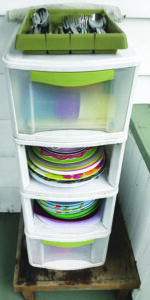 One example is my collection of plates, glasses, cups, bowls, and silverware that I’ve gathered from garage sales and thrift shops. It’s stored in a stackable plastic tower on my side porch during the warm season. (The silverware is always covered.) This has been my alternative to using disposable paper and plastic products at potlucks and family gatherings for many years. More utensils are stored in the basement, because I have enough for 60 place settings.
