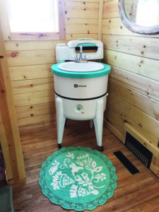 As you can see in the photo, the new sink is set into the top of an old wringer washing machine. The washer had been posted on a local swap and shop website, and the owner was only about 30 miles from my home – an easy trip. The machine was in excellent condition, but needed something to support the sink, because the original tub was too big. My neighbor works with steel, so he fashioned the turquoise ring around the top. It’s perfect for the room.
