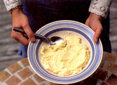 Next, spoon the damp paste into a large bowl. Adding small amounts of cold water, mash the butter with the back of a spoon to remove any remaining buttermilk. Pour off the milky water, taking care not to lose any butter. Continue adding cold water, pressing the butter, and pouring off the liquid until it runs clear. At this point, the butter is ready.