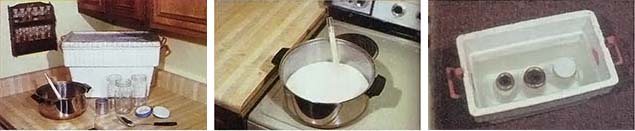The first step in making yogurt is to gather your equipment and ingredients. You’ll need some jars with lids (any clean glass containers will work fine), a large waterbath vessel for keeping your brewing batch warm — either a picnic cooler or a canning pot you can wrap with heavy towels — and standard kitchen equipment, including a measuring cup, cooking pan, and stirring utensil. A food thermometer can come in handy too, but if you don’t have one around, you can “guesstimate” the crucial temperature limits of 100 degrees Fahrenheit and 115 degrees by dabbing some heated water on your inner wrist. Liquid at 100 degrees feels comfortably warm to the touch, but at 115 degrees there’s a bit of a sting.