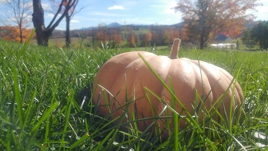Many years ago, my husband and I came across the “Long Island Cheese” pumpkin – a flat, round, variety that looks a little bit like a Cinderella pumpkin but is light-colored. Its beautiful to look at, but even more beautiful to eat (we buy our seeds from the High Mowing Seed company here in Vermont). The flesh is not as dark as a pie pumpkin and is almost akin to a butternut squash.