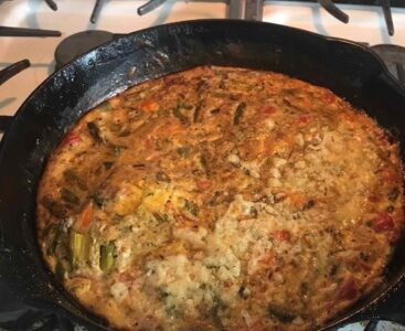 Cooking notes: I added some leftover ham, diced. Bacon or any other meat could be used here as well. Any spices will work here. For a “Mexican” flavor, add cumin, chili powder and oregano. For “Italian,” add basil, oregano and red pepper flakes. You can also add cheese after removing from the oven. I sprinkle about a cup or so over the top and allow the heat to melt it. You can also add the cheese about 5 minutes from the end of baking.