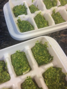 Since pesto has oil and cheese, no canning allowed. I have committed, due to ease and great results, to freezing mine in ice cube trays and storing in freezer containers or bags. I can thaw a couple of cubes for Friday night pizzas in 30 seconds or so by nuking it. This is gourmet, sun-shiney, healthy convenience food! So here’s my recipe, tweak to your tastes, enjoy!