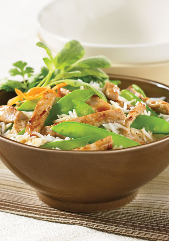 - Toss well. Cook, tossing occasionally, until most of the pork is no longer pink, about 1 minute more. Add sugar snap peas and toss well.