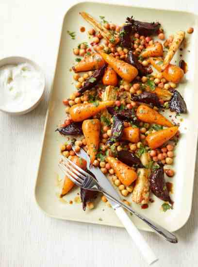 Today’s recipes often call for all sorts of weird and wonderful ingredients destined to languish in the back of the pantry until they reach their ‘best before’ date. You might consider this sweet-and-sour pomegranate molasses to be one of them. Think again. The syrup makes a fabulous Middle Eastern dressing with a touch of lemon juice and plenty of olive oil, and can be brushed on roasting chicken, duck or lamb for a glorious glaze, is fantastically refreshing when mixed with chilled fizzy water and seems to keep ad infinitum. Naturally sweet root vegetables and chickpeas make a great combination with the yogurt, but it’s the pomegranate molasses and spices that lift this dish onto another plain.