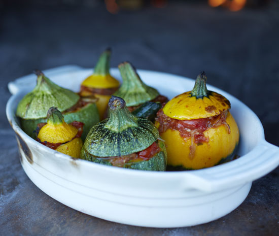 - Cut the tops off of the squashes. Using a spoon or melon baller, hollow out the centers of each squash. Place the hollowed squashes and tops in a medium bowl, dress with the sunflower oil and toss well to coat. Season with salt.