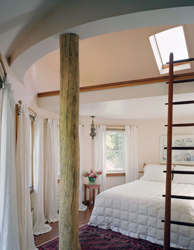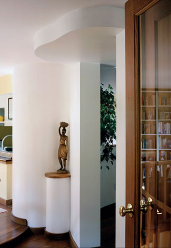The house, once tall and dark with a box-shaped façade, is now a gleam of open spaces topped off with an arching tower graceful enough to house Rapunzel. Inside, more curved walls painted in calm, earthy hues add shape and texture to areas that unfold and guide visitors naturally from room to room, or in the case of the tower, from the driveway to her front door.