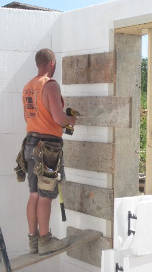 In this photo, a worker is installing 2 x 12 braces alongside the opening of the garage door before the concrete pour.