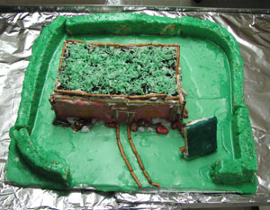 OK, so maybe we got a little carried away with the green theme, because the — literally — green frosting is a bit out of control (see photos at left). It’s all supposed to represent grass and hedges (the yard is surrounded by Rice Krispies treats covered with frosting).