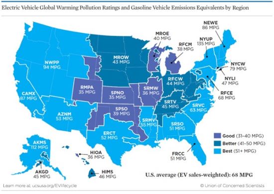 This graphic fromthe Union of Concerned Scientists illustrates how driving an EV in each region compares with driving a gas-powered car when it comes to emissions. The regions are based on the group of power plants that serve as each one’s primary source of electricity.