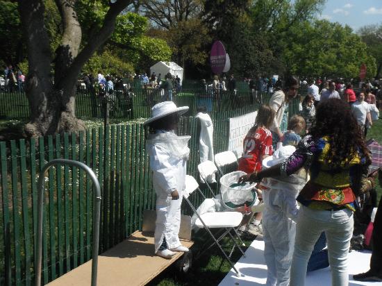 We went to Washington D.C. over the Easter Holiday at the invitation of the Montgomery County Maryland Beekeepers Association to work with them at the Annual Easter Egg Roll on the South Lawn of the White House. There beekeepers, Master Gardeners, Whole Earth Foods, Seed Savers and a lot of other groups have small displays on the South Lawn all day, instructing and informing people who are visiting and taking part in the egg roll about all manner of green and growing things. Something like 30,000 people attend this event, and it’s a great opportunity to expose people to gardening, beekeeping and pollination, good food recipes and cooking, and assorted activities like hula-hoop spinning, egg dying, and listening to lots of good, live music.