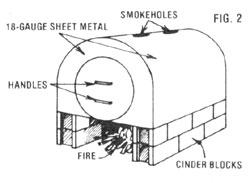 With all that done, cut two pieces of 18-gauge non-galvanized sheet metal to fit around the ends of the drum, and then trim out a large rectangle of sheet metal and bend it over the barrel. . . so that the entire apparatus forms an enclosed air space around the oven (as shown in Figure 2). Attach the sheet-metal sections to the pipe frame and to each other, using tabs and screws or brazing. Then set the oven on a U-shaped, two-tiered row of cinder blocks.