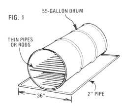 To begin, weld a frame measuring 36 inch wide and as long as your barrel (Pete uses the 55-gallon size) from 2 inch non-galvanized steel pipe. Then cut the top off of a non-galvanized 55-gallon drum and weld the open barrel to the frame. Now, using the end of yet another barrel of the same size for raw material, fashion a tight door (it’s best to crimp in the edges of the cover to assure a secure fit) and then weld on two strips of metal for handles. Next, weld three or four rows of level rods (you could use thin pipes for this task) inside the oven to serve as racks (see Figure 1).