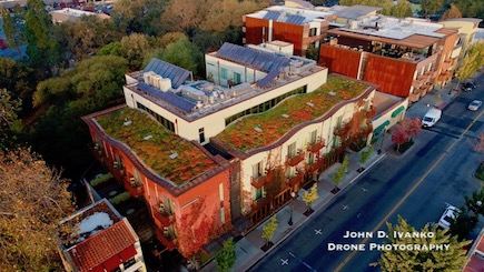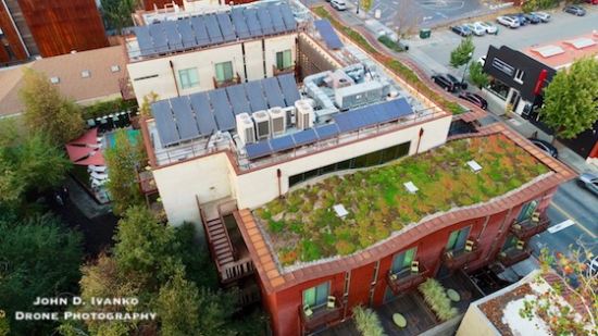You know you’re in the right place when you look up and see the wavy roof with thousands of native succulents, such as the tight rosettes of the ghost plant and shrubby Cotyledon, growing on top. Welcome to H2 Hotel, a US Green Building Council’s LEED Gold Certified Green hotel in the center of Healdsburg. There are solar thermal system panels used to heat the swimming pool’s water and a small PV system on the roof, too. Nearly all of the water is cleverly captured on the roof and grounds, filtered and then used for irrigation.