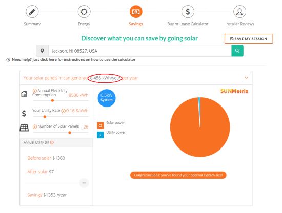 Here is an example for a south-facing roof in Jackson, New Jersey (see image below). Let’s assume that your average annual electricity use is 8,500 kWh, which is slightly above the state average of 8,036 kWh/year. Using the Solar Power Calculator, you can adjust the Annual Electricity Consumption slider so that it reflects your electricity use and then adjust the Number of Solar Panels slider until the solar electricity production matches (and the blue wedge in the orange circle is minimized).