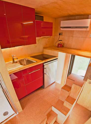 Go up the first flight of space-saving stair steps and you’ll find yourself on the kitchen/bathroom level. The bathroom features a composting toilet, full-sized shower and washing machine. The kitchen comes complete with an induction cooktop, microwave, sink with drain, energy-efficient mini fridge, cupboards for storage and re-circulating range hood. Next to the kitchen, up another set of space-saving stairs, is a natural latex and organic cotton double bed with storage space at its foot.