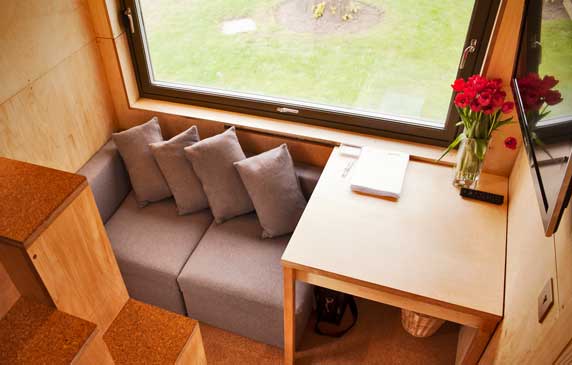 The Cube’s lounge is the first room visitors see upon entering the building. The dining room table slides out from the wall, allowing two people to eat across from each other. When not in use, the dining room table slides back against the wall and the two custom-designed storage chairs slide together to form a sofa, a perfect spot for watching the home’s LED TV. Photo By Allan MacDonald/Courtesy CubeProject.org.uk.